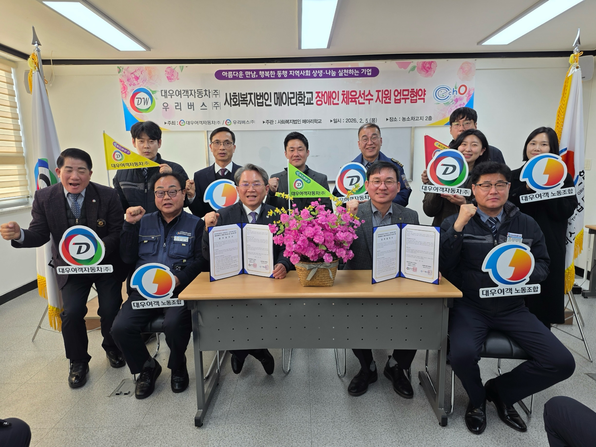 대우여객자동차(주),우리버스(주)와 사회복지법인 메아리 – 장애인 체육선수 성장 지원과 지역사회 상생과 나눔 문화의 확산을 위한 협약을 체결하게 되었습니다. 이번 협약을 통해 장애인 체육인들에게 훈련 지원, 경기 참가 기회 확대 등 그들의 꿈과 희망을 함께 키워나갈 예정입니다. 메아리학교 선수들이 자신의 속도로 꿈을 향해 달려갈 수 있도록 대우여객과 우리버스가 든든한 지원 파트너가 되어주리라 기대합니다. 모든 선수가 자신의...